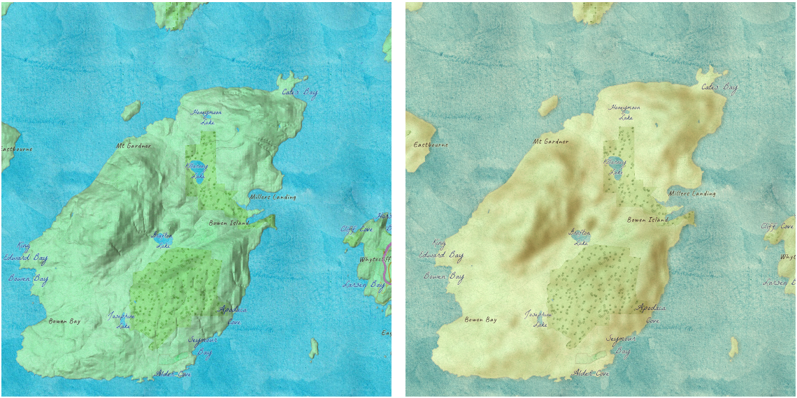 // hillshade layer is displayed under the water color layer hillShadelayer.effect = "saturate(400%) contrast(100%) blur(10px)"; waterColorLayer.effect = "sepia(50%) saturate(100%) contrast(100%)";