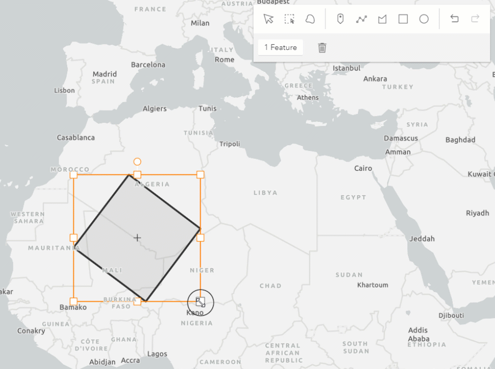 The Sketch widget provides users with the ability to move, rotate, scale or reshape graphics during an update operation. To begin updating, Left-click on a graphic. Use Shift+Left-click to add more graphics to the selection, for bulk updating. Once graphics are selected, the following actions can be performed.