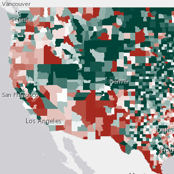 Drawing improvements include faster processing of data values in visualizations so they can be updated more rapidly, providing a better user experience and improved performance. FeatureLayer updates are faster when changing the variable driving the visualization. The animation below showcases the change between 4.11 and 4.12.