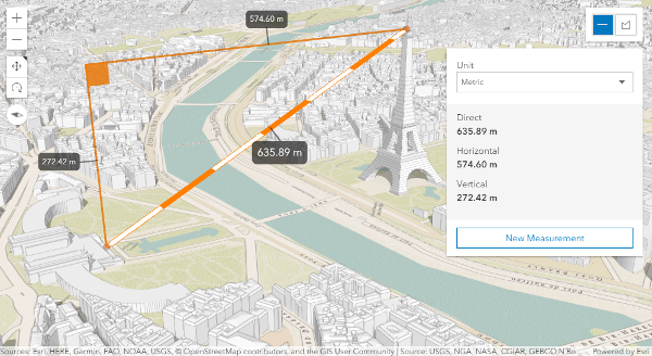 Measuring the vertical, horizontal, and direct distance between two points is now possible with the DirectLineMeasurement3D widget. When the widget is active, a horizontal "laser" line is drawn which indicates the height at the current mouse position. This line can help in analyzing the heights of objects relative to each other and the terrain.